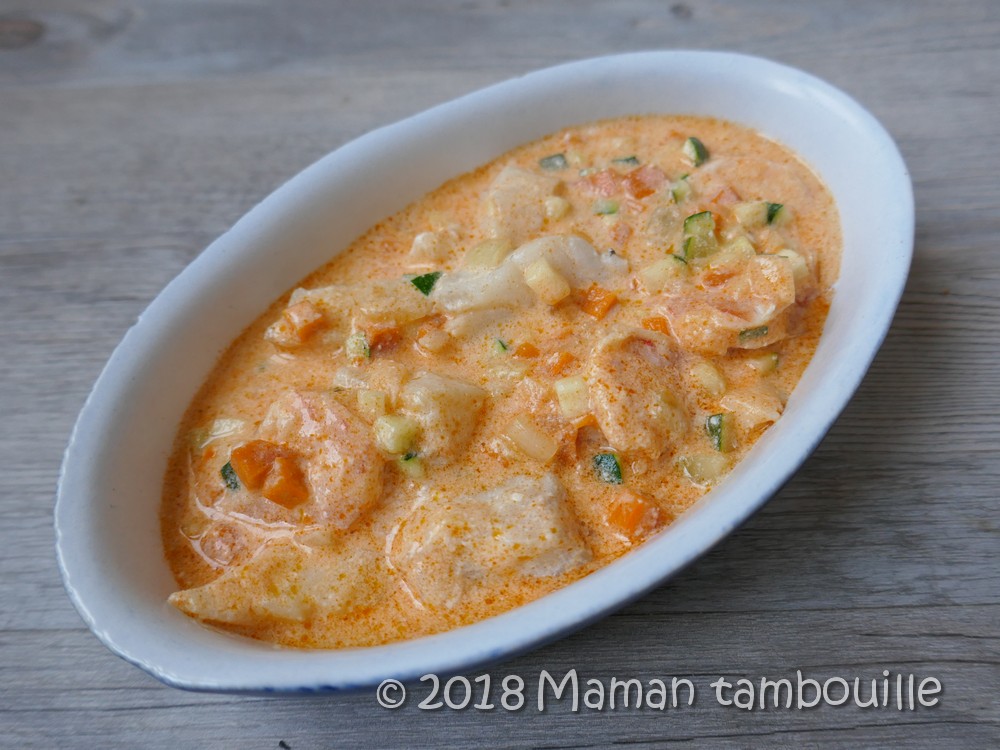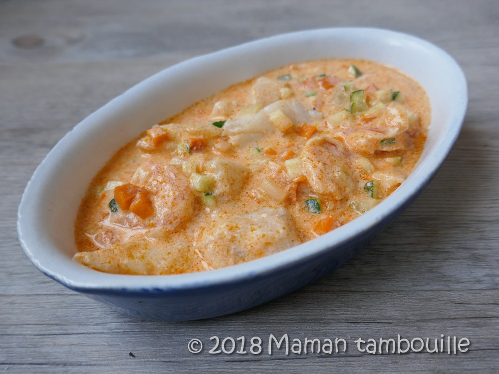 Voilà un plat de poisson gourmand et savoureux tout en étant plutôt léger. Du cabillaud, des crevettes, des dés de légumes croquants, une touche de sauce tomate et de la crème légère: pas trop de complexe avec cette assiette. Bien sûr, si vous voulez rester sur un plat « light », il faudra éviter les tranches de pain pour saucer … quoique, difficile de résister tellement cette sauce est bonne ;-).