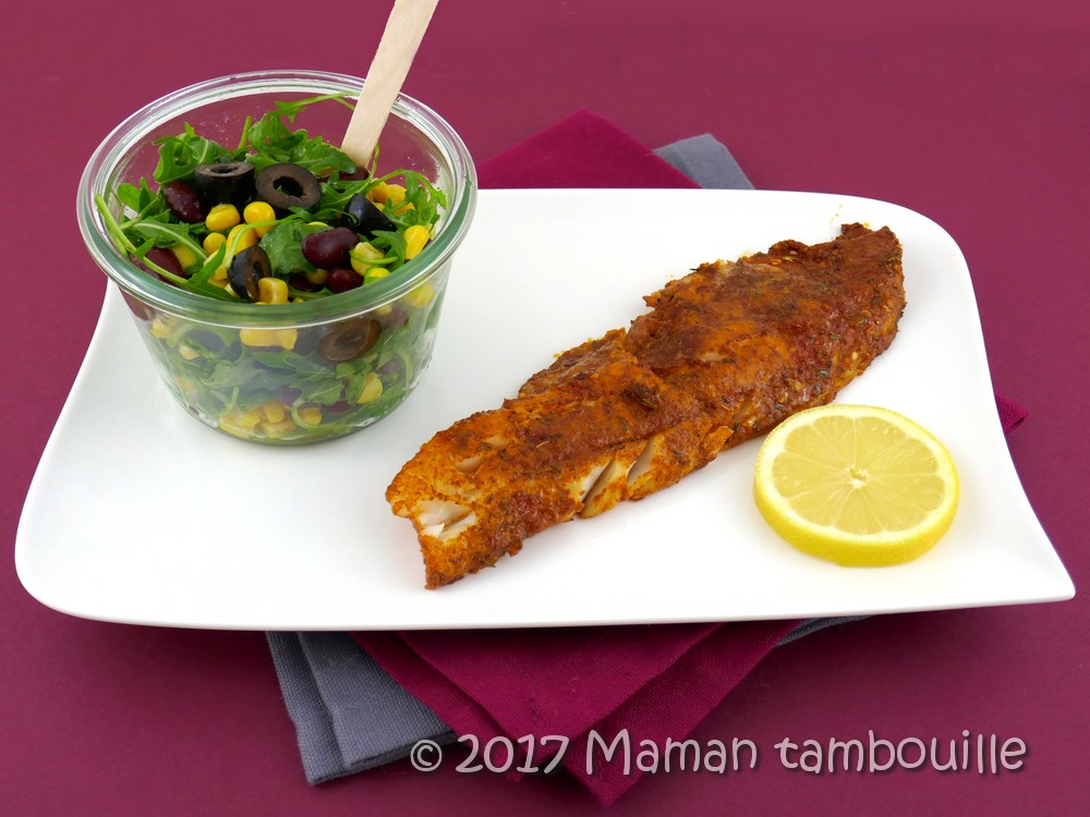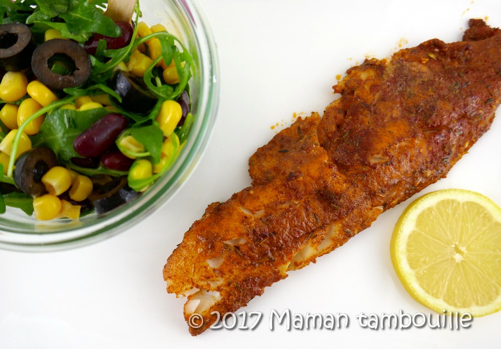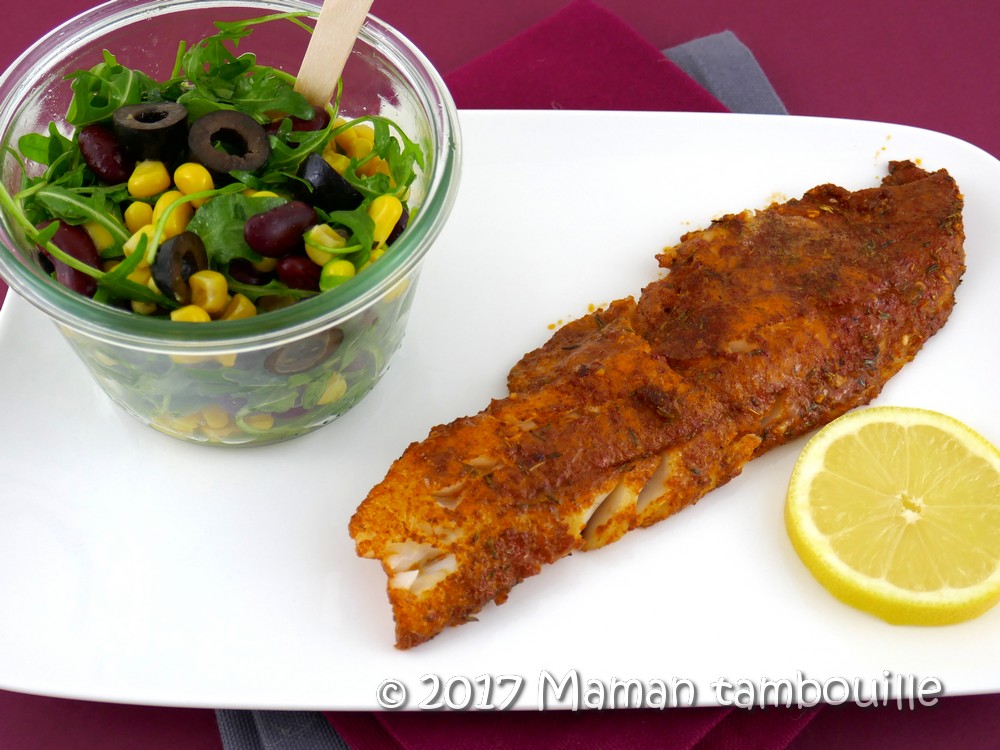 Pour cette fois, j’ai choisi de « paner » mon filet de merlan d’une fine couche d’épices cajun, un petit mélange que j’ai fait maison pour l’occasion. Et, pour accompagner mon poisson, j’ai préparé une petite salade type mexicaine assaisonnée à l’huile d’olive.