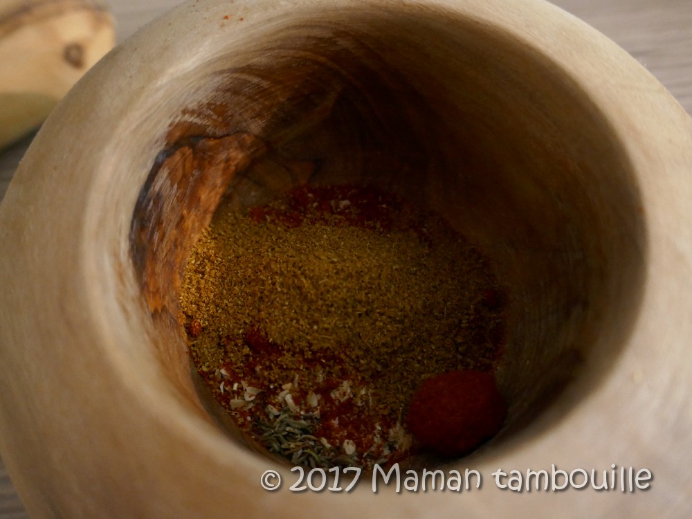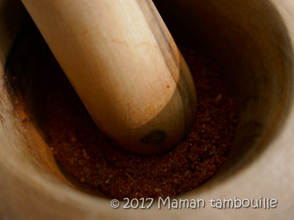 Mettre toutes les épices (sans la farine) dans un mortier.