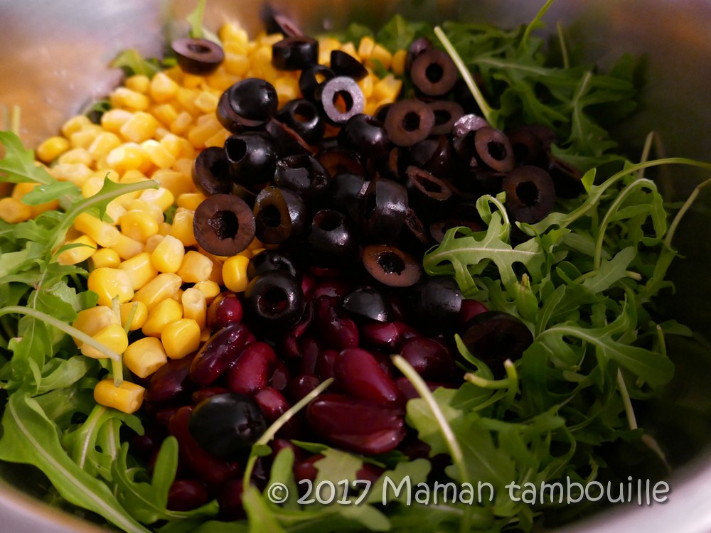 Préparer la salade en mélangeant la roquette, les haricots égouttés et rincés, le maïs égoutté et les olives en rondelles.