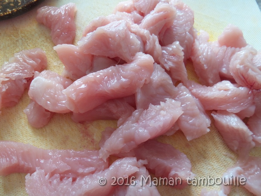 Couper le poulet en lamelles.