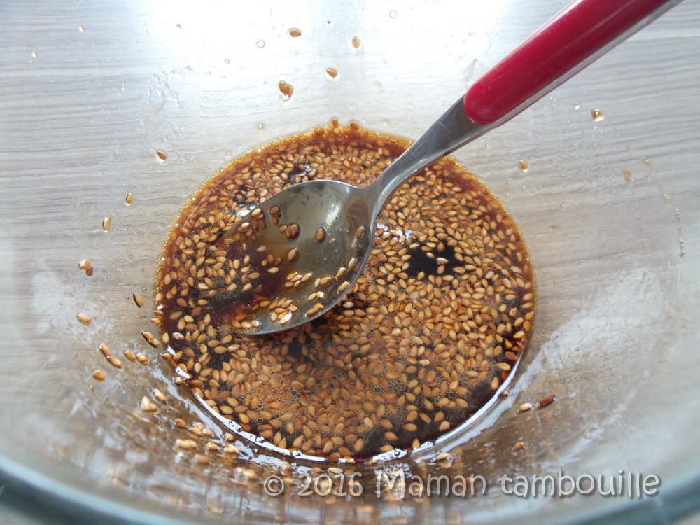 Dans un saladier, mélanger le miel, la sauce soja et le sésame.