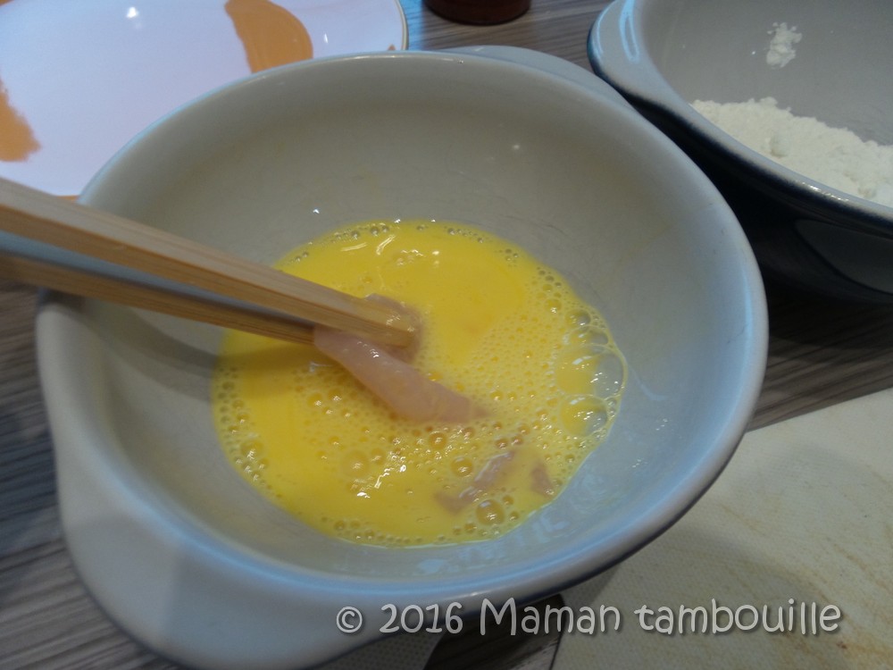 Passer une lamelle de poulet dans le bol d’œuf.