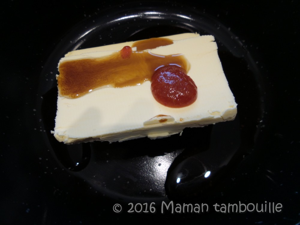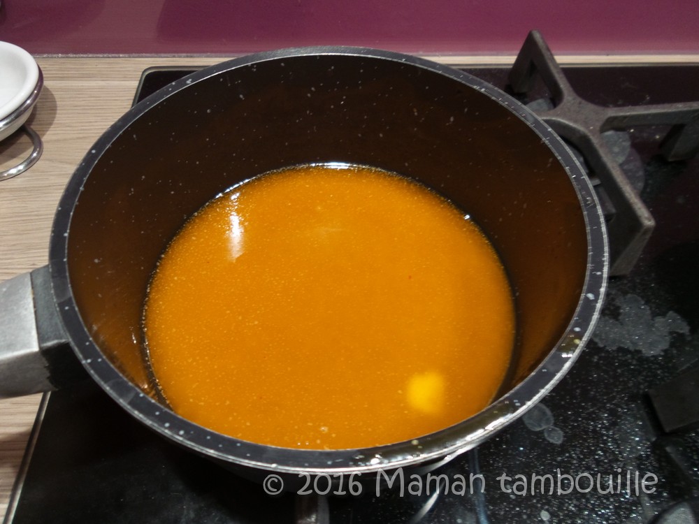 Ajouter le nuoc mam, le soja et la sauce chili. Chauffer à feu doux pour faire fondre la margarine et bien mélanger le tout.