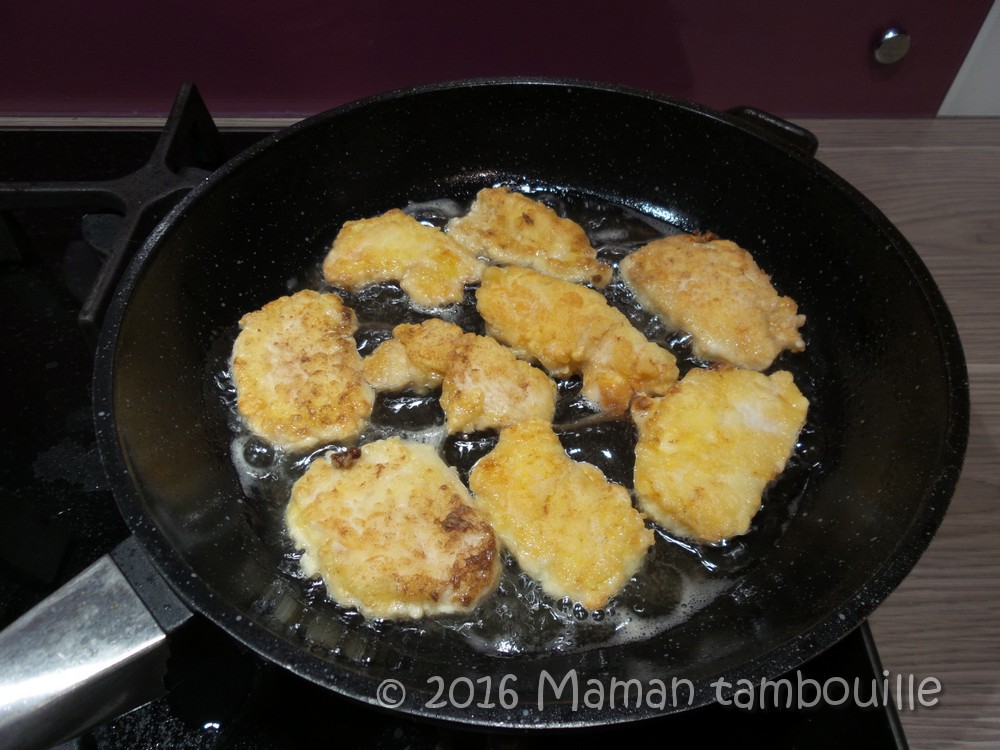 Quand l’huile est chaude, mettre 4-5 morceaux de poulet panés et laisser frire environ 3 min (1 min 30 de chaque côté). Les morceaux ne seront peut-être pas totalement cuit mais c’est normal, ils auront une 2ème cuisson par la suite.