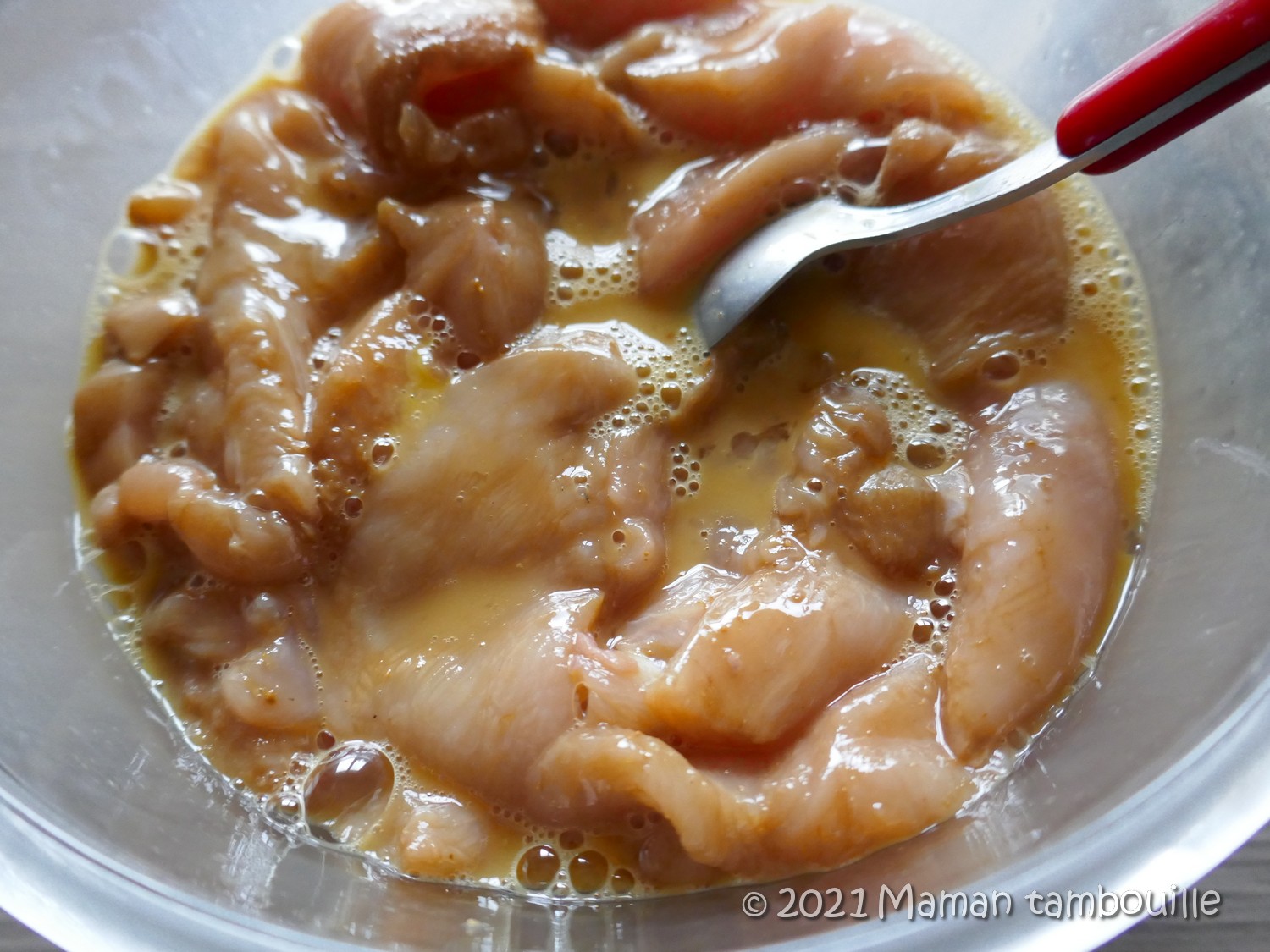 Une fois mariné, battre 2 oeufs dans un saladier. Y mettre les morceaux de poulet égouttés. Mélanger.