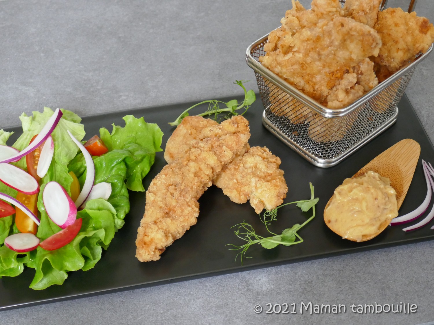 Alors voilà, avant, je me prenais la tête à faire mariner le poulet dans du lait puis à préparer un saladier de corn flakes écrasés pour paner mes morceaux de poulet et que ça en mettait partout. Certes, c’était bon mais le résultat n’était pas non plus identique et je voyais bien que ce n’était pas la bonne méthode.
