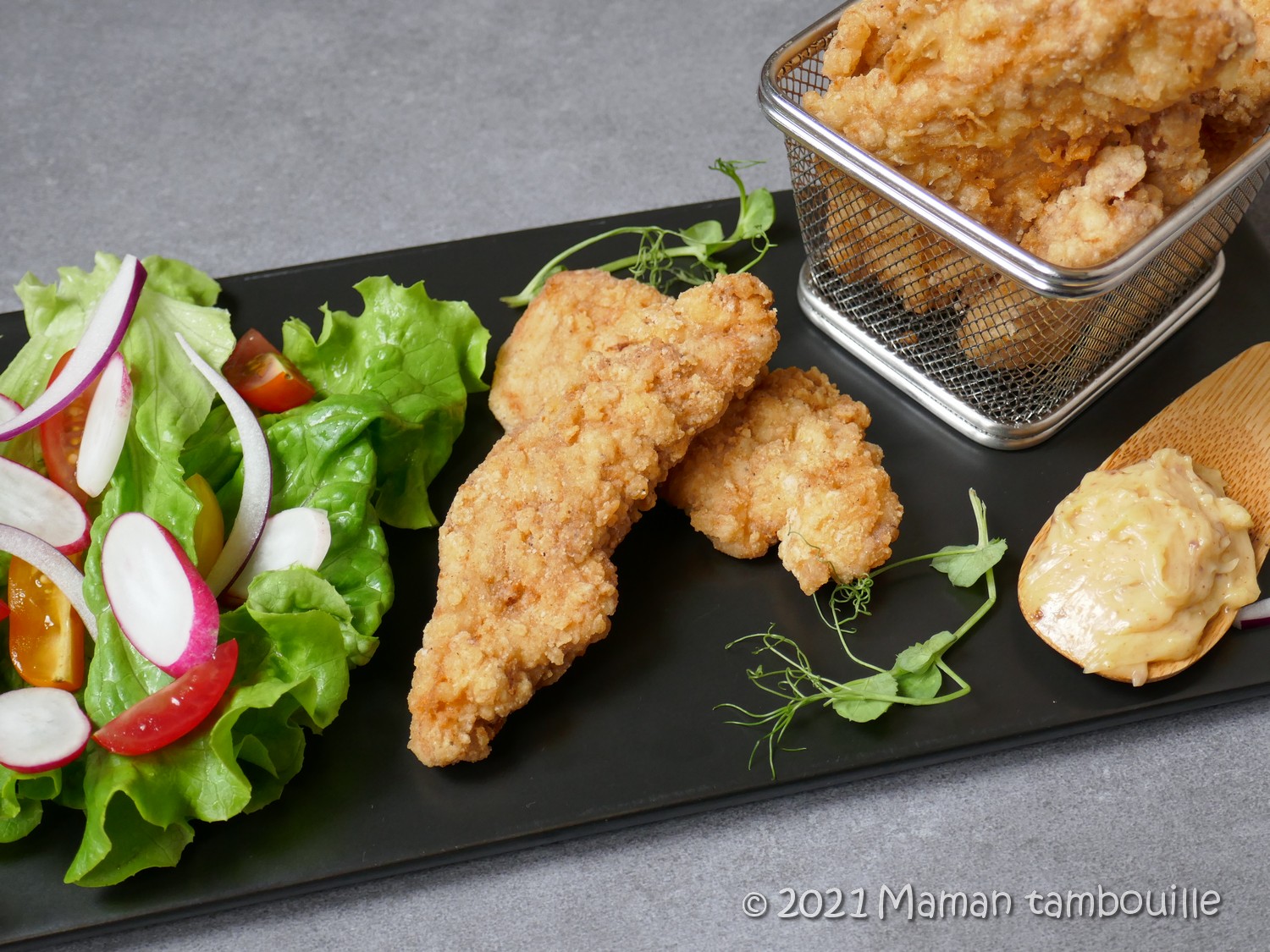 Parfois on se complique la vie pour arriver à un résultat à moitié satisfaisant alors que la solution est aussi simple qu’enfiler une paire de chaussettes ! Aujourd’hui, je m’attaque au poulet façon « tenders de KFC », ces tendres morceaux de poulet délicieusement croustillants qui font craquer mes enfants. Avouons le, poulet utilisé chez KFC est bien loin des poulets fermiers, il ne faut mieux pas savoir d’où ils viennent mais bref, passons puisque là, on va les faire maison et donc on sélectionner le poulet qui nous convient.