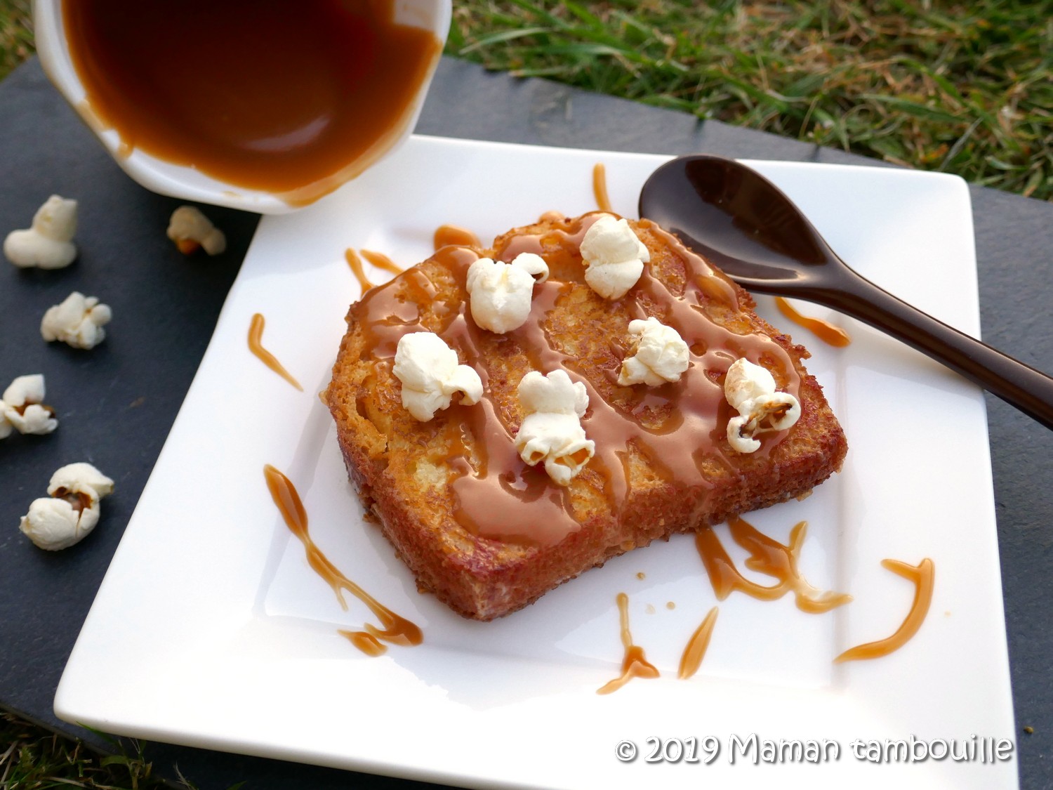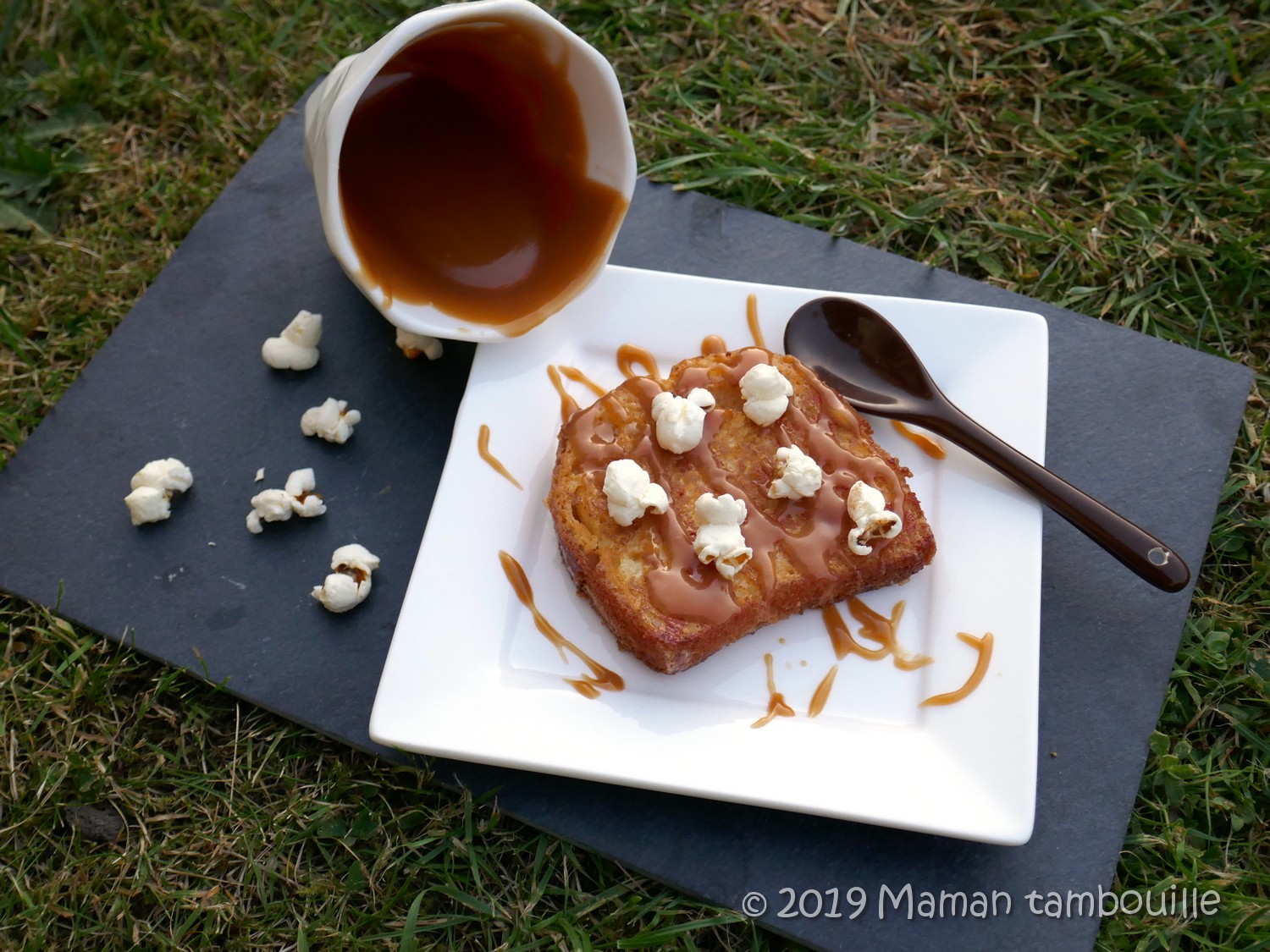 Servir aussitôt nappé de caramel tiédi et parsemé de pop corn.