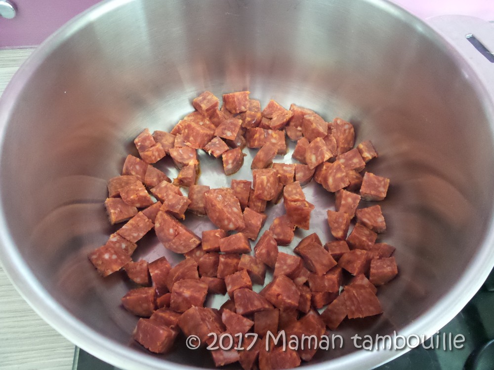 Eplucher le chorizo et le couper en dés. Le faire revenir dans une cocotte pour le dégraisser.
