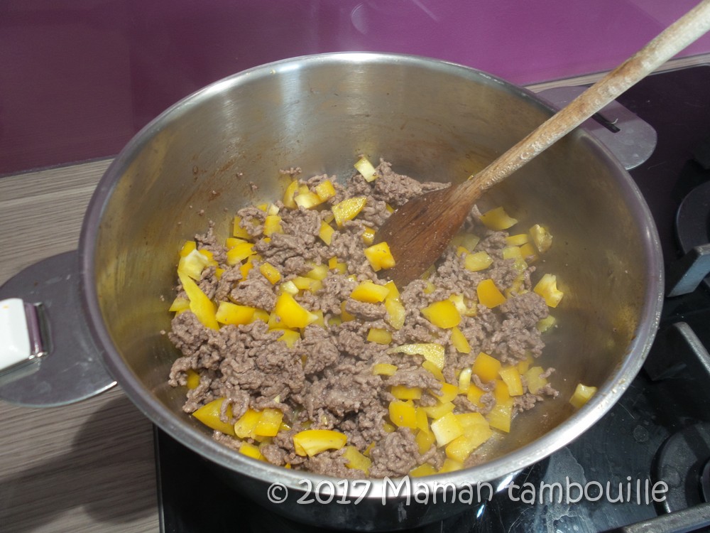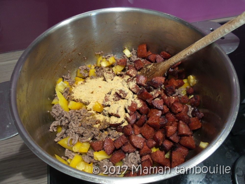 Ajouter le sachet d’épices, le chorizo et un demi verre d’eau. Mélanger, couvrir et laisser mijoter 5 min à feu doux.