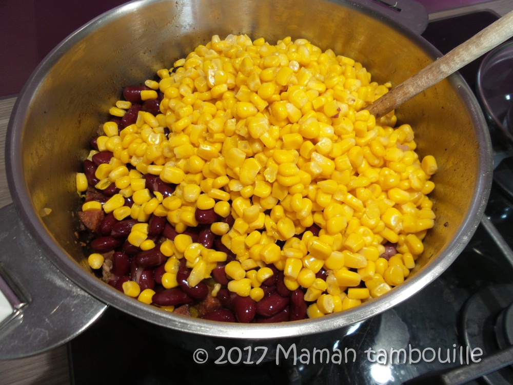 Ajouter le maïs et les haricots. Mélanger et laisser mijoter 15 min à couvert et à feu doux.
