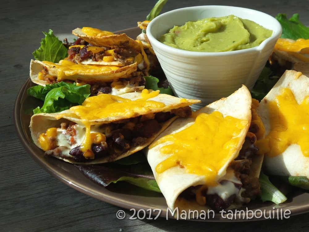 Servir aussitôt avec des feuilles de salade et un pot de guacamole.