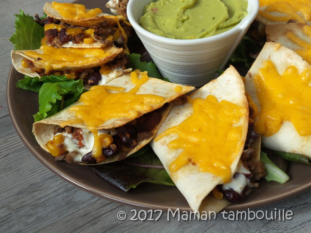 Bref, je m’égare, vous êtes là pour avoir des recettes alors j’en reviens à mes quesadillas, un plat du mercredi (du mercredi de la semaine dernière d’ailleurs !) publié un vendredi mais j’espère que vous ne m’en voudrez pas, de même que pour la fréquence de mes publications moins régulières ! J’ai beau vouloir être sur tous les fronts, et ben j’y arrive pas, j’ai perdus mes supers pouvoirs 😥