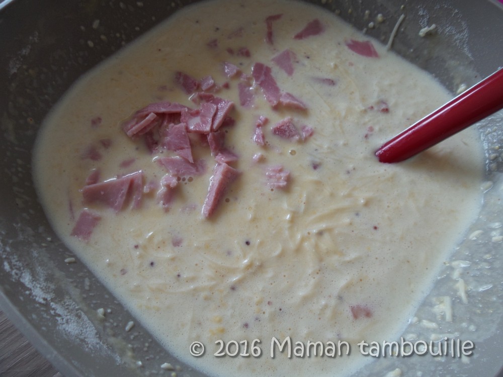 - 3 tranches de jambon blanc (il m’en restait alors je les ai mises mais vous pouvez ne pas en mettre et ajouter plus de lardons)