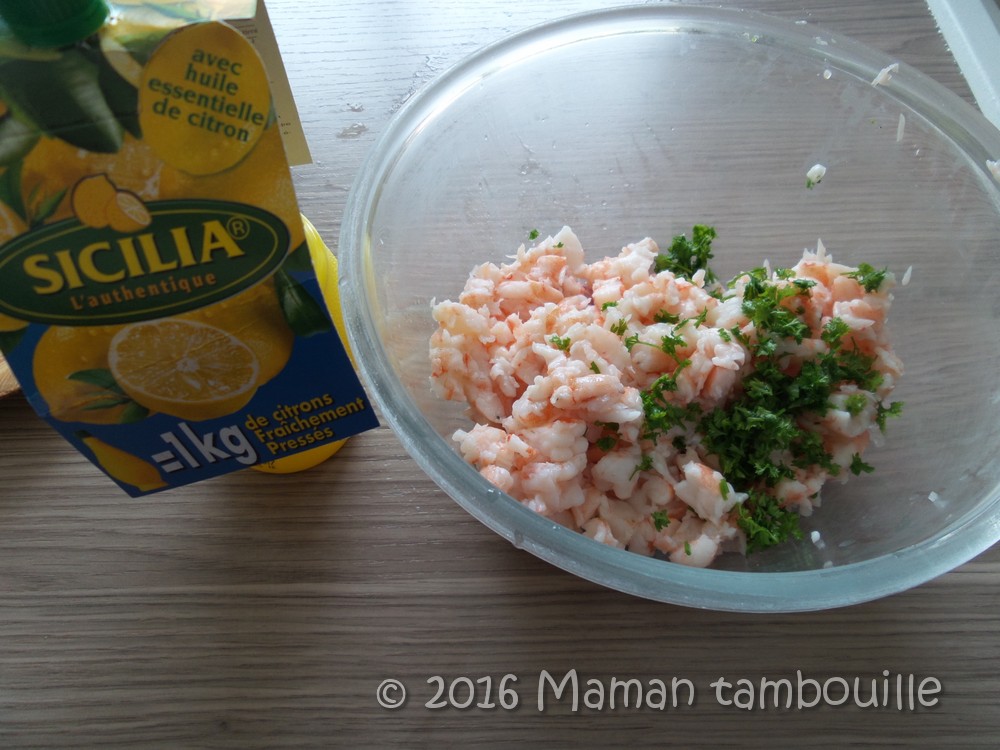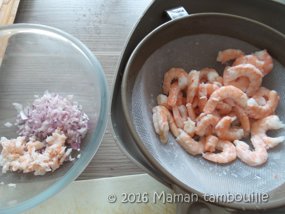 Couper les crevettes en petits morceaux et les ajouter avec l’échalote.