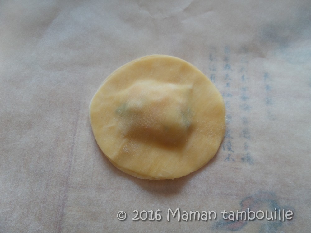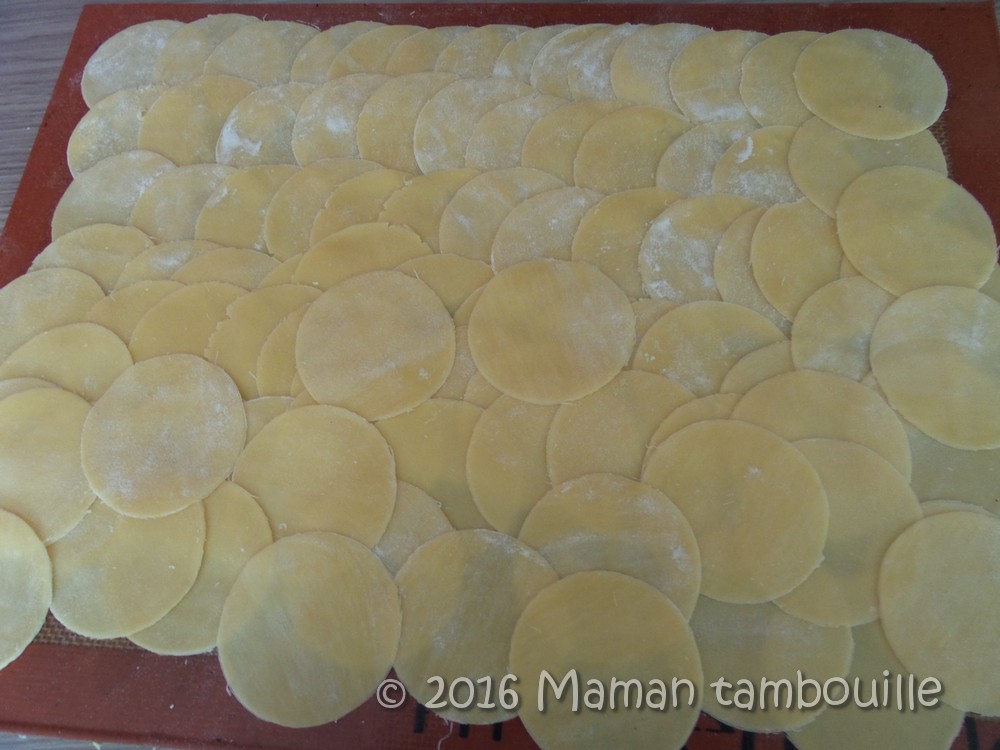 Découper des disques avec un emporte pièce (6cm pour moi) et les déposer au fur et à mesure sur une plaque farinée. Couvrir d’un torchon les disques entre chaque étape pour ne pas qu’ils sèchent et ce jusqu’à épuisement de la pâte.