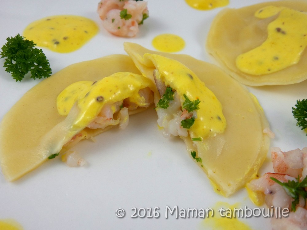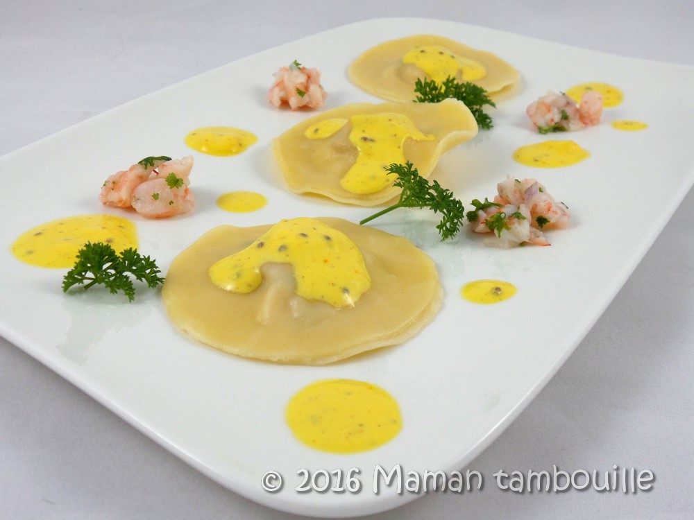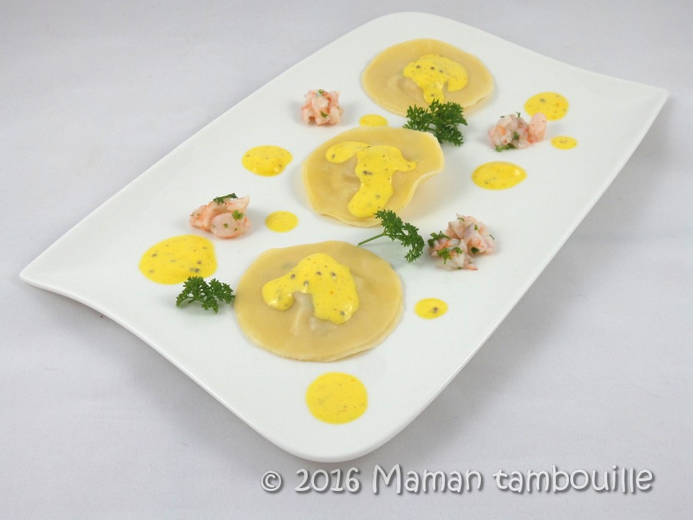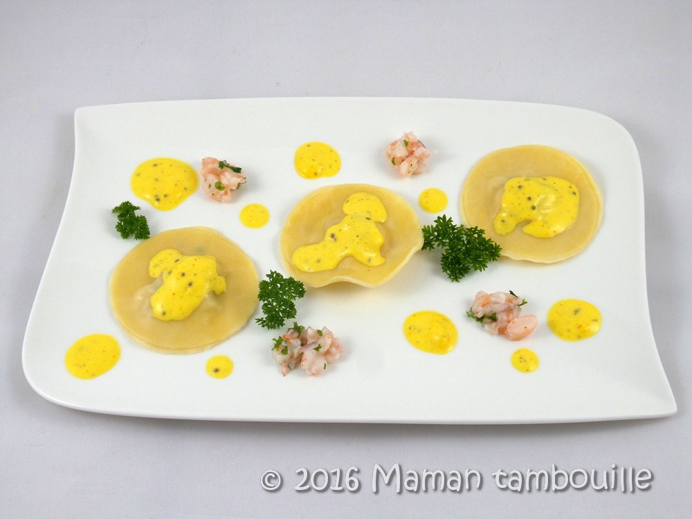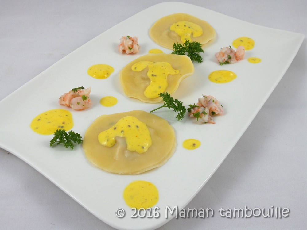 Oh la la, je me délecte encore de cette assiette, une impro de ravioles maison farcies de crevettes, le tout relevé avec une sauce safranée à la moutarde à l’ancienne.