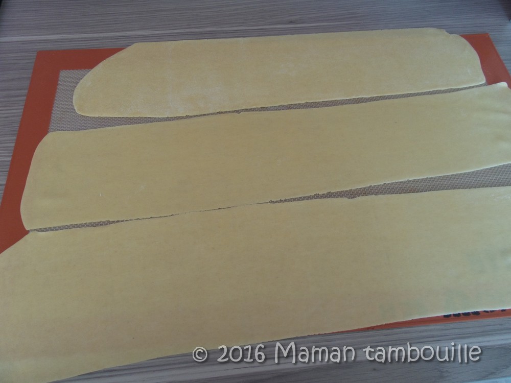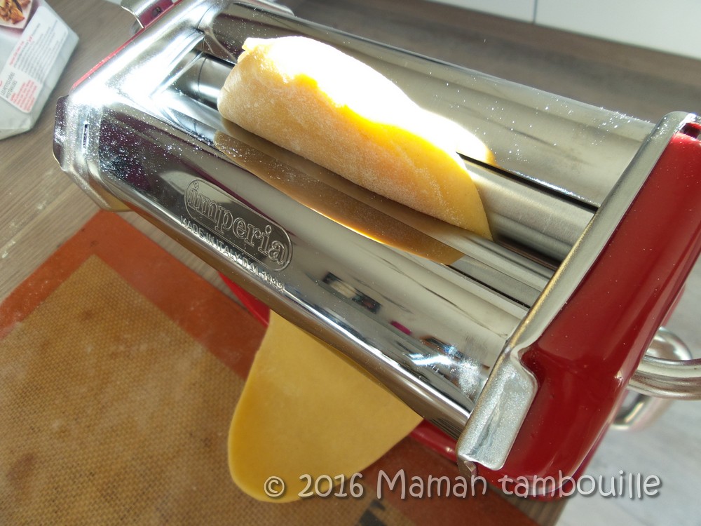 Repasser la pâte en descendant de cran pour arriver au dernier cran (numéro 7 pour ma machine) et avoir l’épaisseur la plus fine.