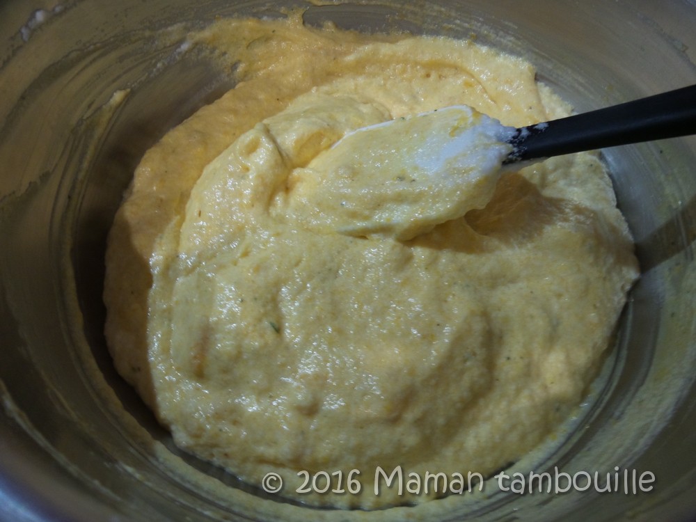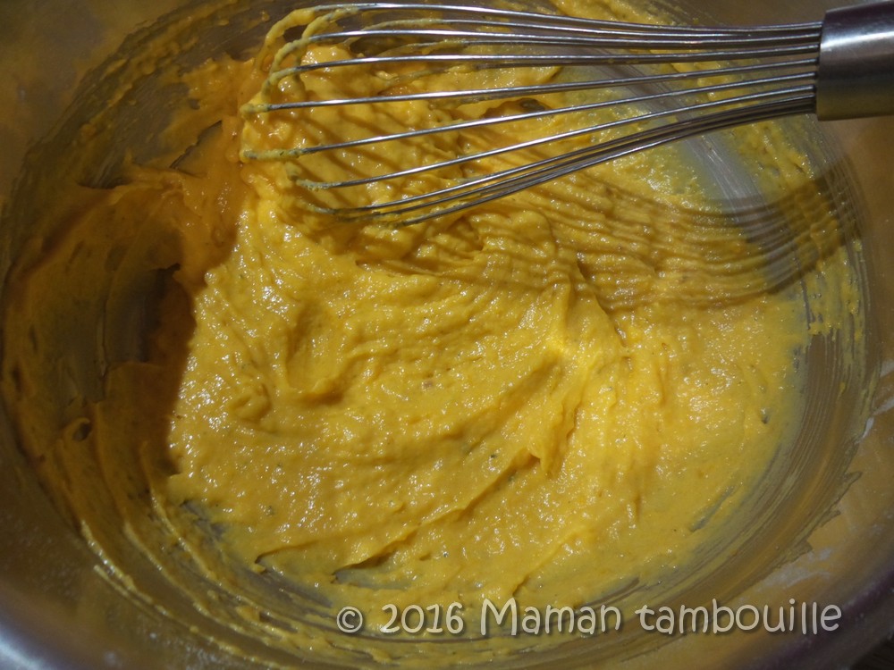 Dans un saladier, mettre la purée de courge, les jaunes d’oeufs, la farine, du sel et la levure.