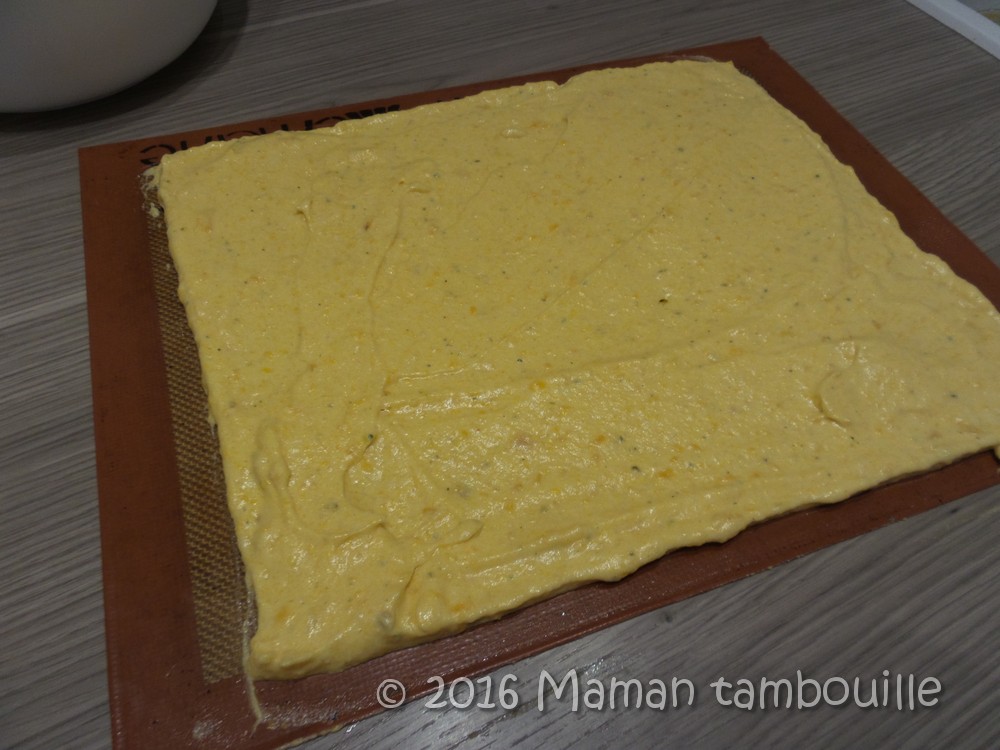 Etaler en rectangle sur une toile silpat ou une feuille de papier cuisson sur une épaisseur d’1,5 cm environ.