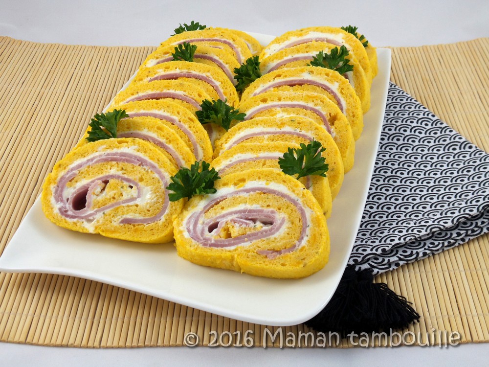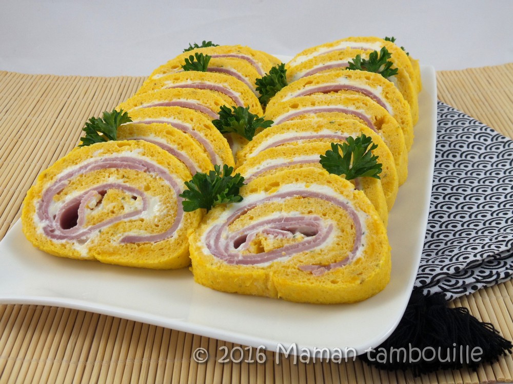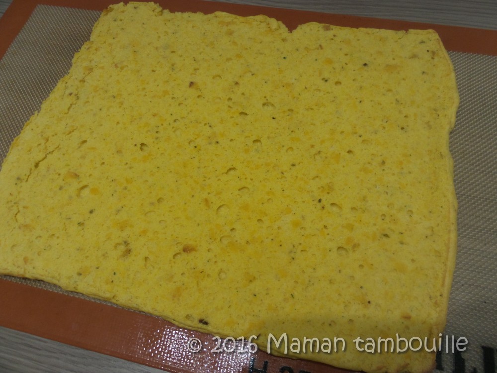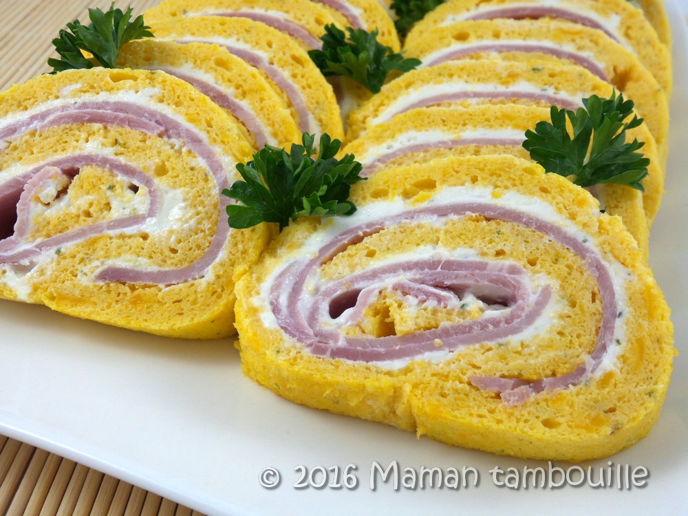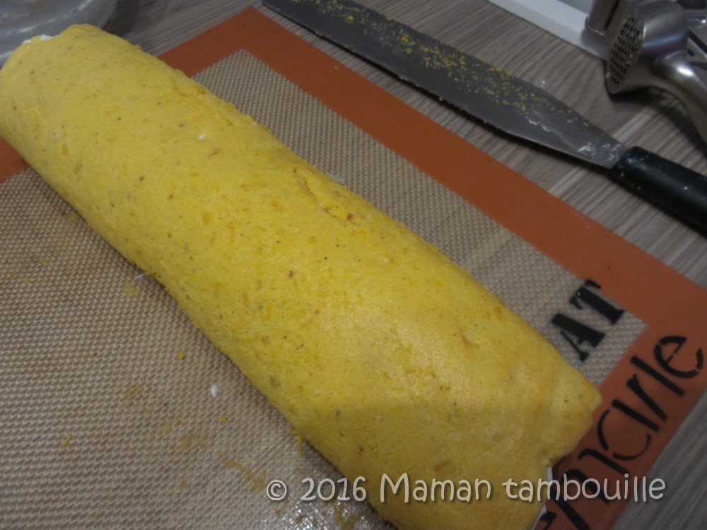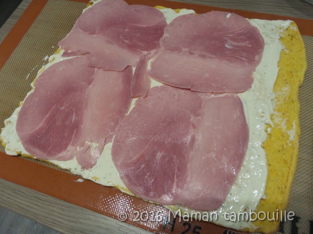 Après le roulé aux épinards ou à la carotte, j’ai tenté un roulé automnal à la courge butternut. Pour la garniture, j’ai fait classique: jambon et fromage à l’ail.