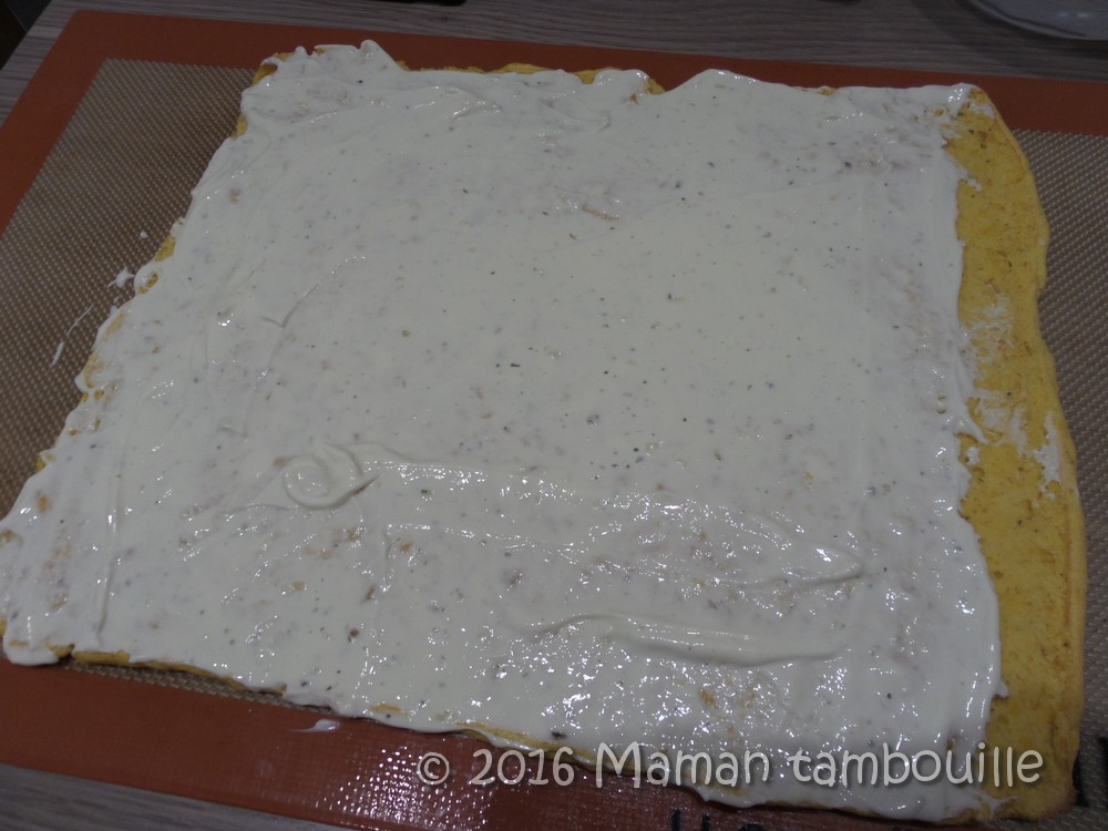 Tartiner le dessous du roulé (le côté pas lisse) de fromage frais sans aller jusqu’au bout. Lisser pour égaliser la couche de fromage.