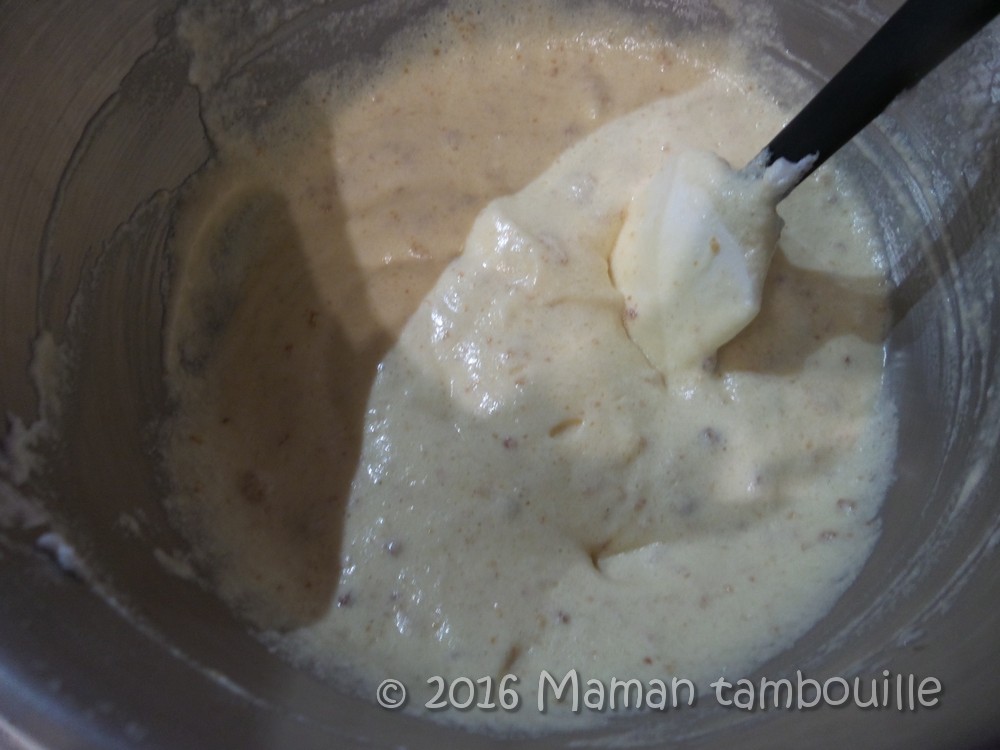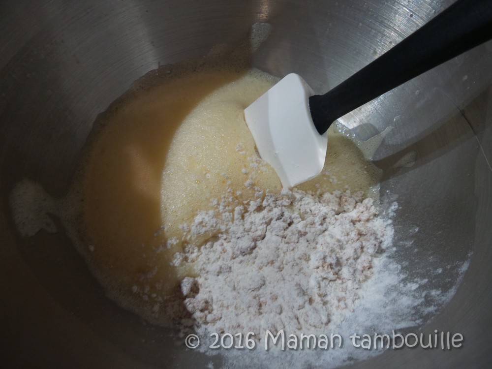 Ajouter le reste de farine, mélanger puis le reste de blancs. Mélanger.