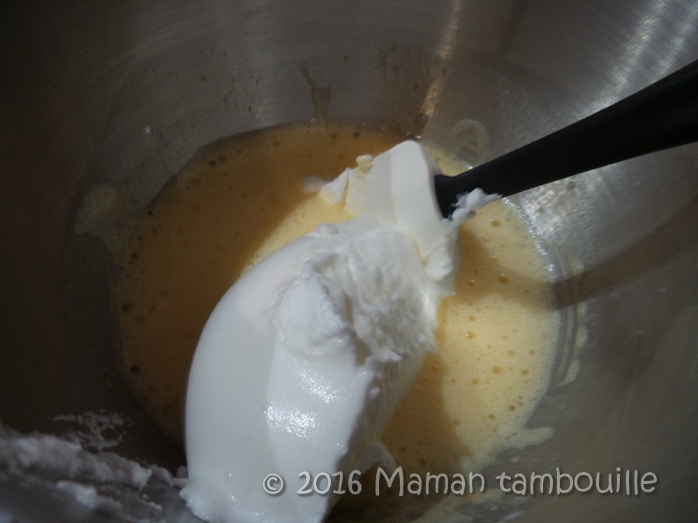 Ajouter la moitié des blancs en neige et mélanger avec une spatule.