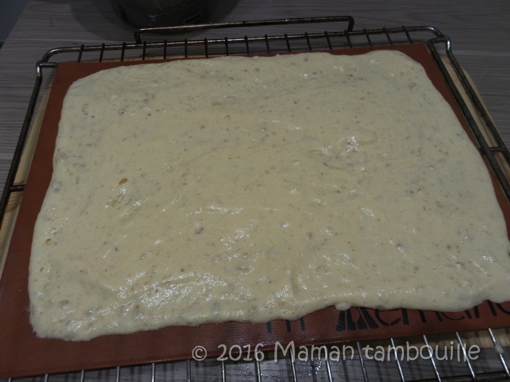 Etaler la pâte sur une toile silpat ou une plaque couverte de papier cuisson. Lisser la surface pour avoir une épaisseur régulière.