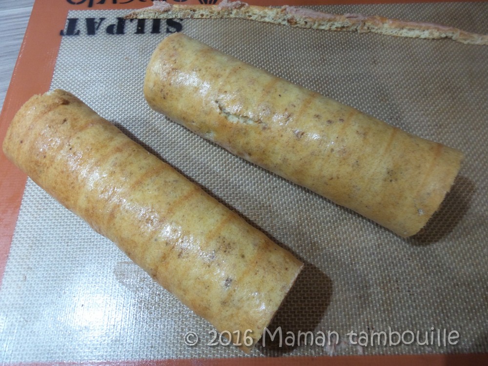 Rouler sur la longueur en serrant bien. Couper le rouleau en 2.