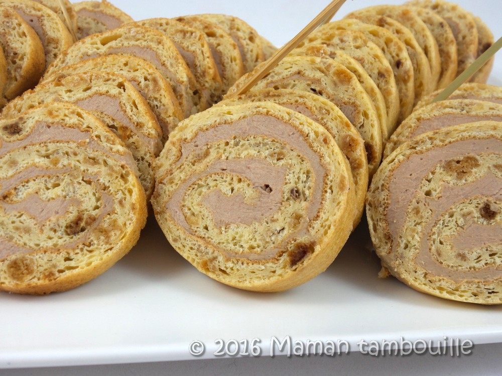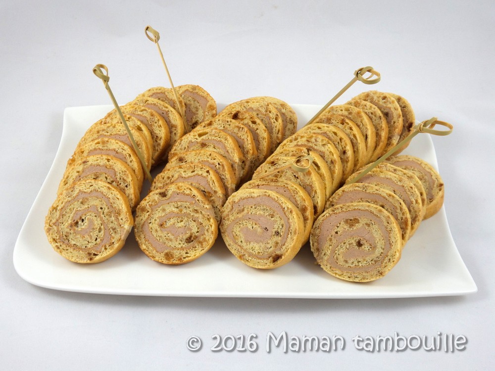 Une idée pour l’apéritif jolie et très bonne: des roulés au pain d’épices et mousse de canard. J’ai trouvé la recette ici. A l’origine, il fallait mettre des spéculoos dans la pâte du roulé mais j’ai reçu du pain d’épices dans la dernière Degustabox alors j’ai remplacé les speculoos par ce dernier.