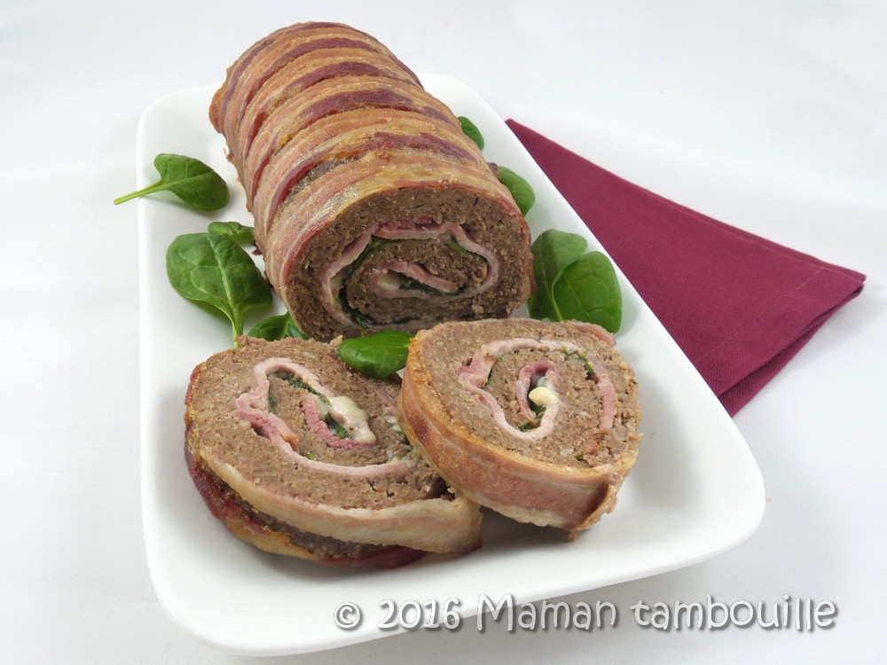 Je pensais que ce roulé serait difficile à réaliser car je pensais que rouler de la viande hachée relevait de l’exploit … que nenni ! Ca se roule super bien et sans aucune difficulté. J’ai remplacé le morbier par du fromage à raclette et le jambon blanc par du jambon fumé, le tout roulé dans de la poitrine fumée.