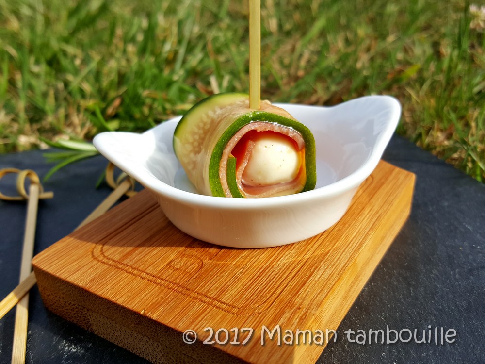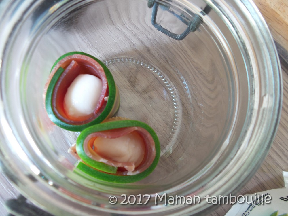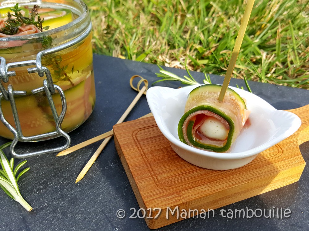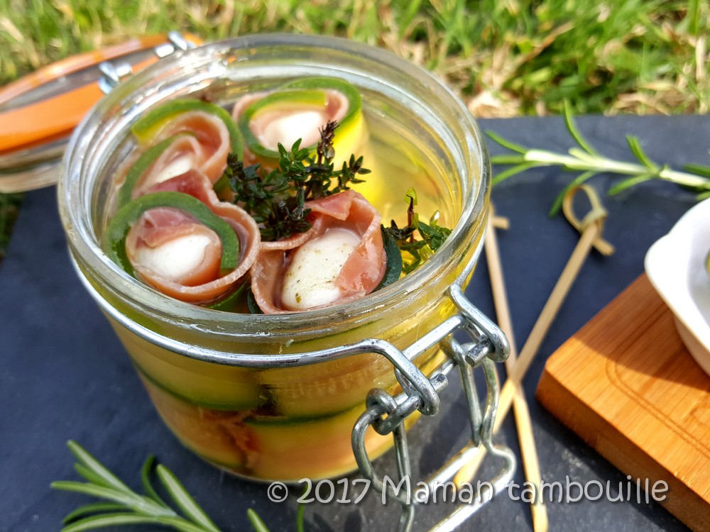 Une idée pour l’apéritif qui change un peu, type tapas: les roulés de courgette mozzarella et jambon serrano marinée dans de l’huile au romarin.