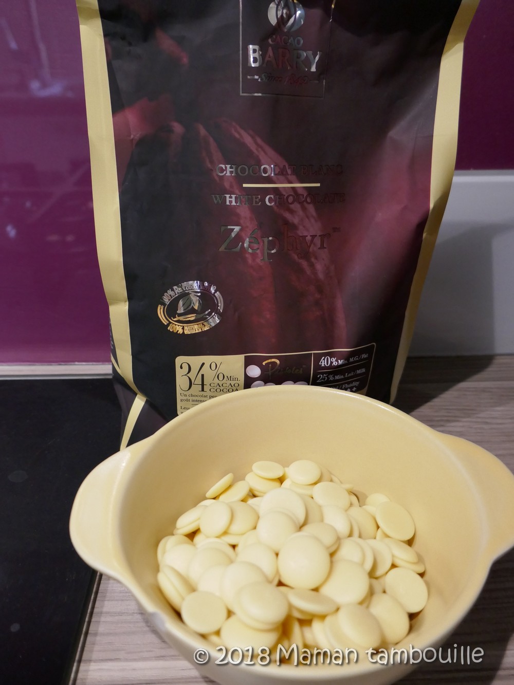 - 170 g de chocolat blanc (Chocolat blanc Zephyr 34% pistoles 1 kg Barry)