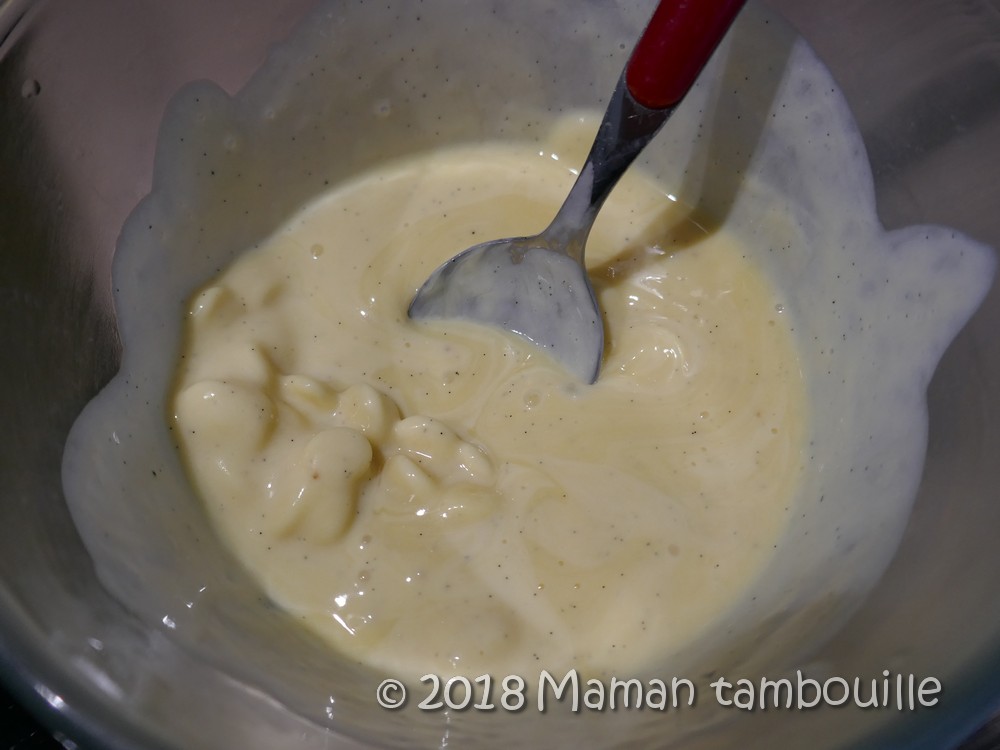 Plan B, j’improvise avec ce que j’ai sous la main et ça se termine par un crémeux chocolat blanc/vanille, une recette que je maîtrise et que j’adore.
