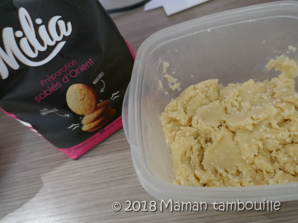 - une base de biscuits sablés (j’ai utilisé un demi sachet de préparation pour sablés d’Orient Milia reçu dans la dernière Degustabox)