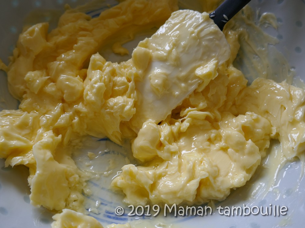 Dans un grand saladier, travailler le beurre pommade avec l’huile à l’aide d’une spatule.