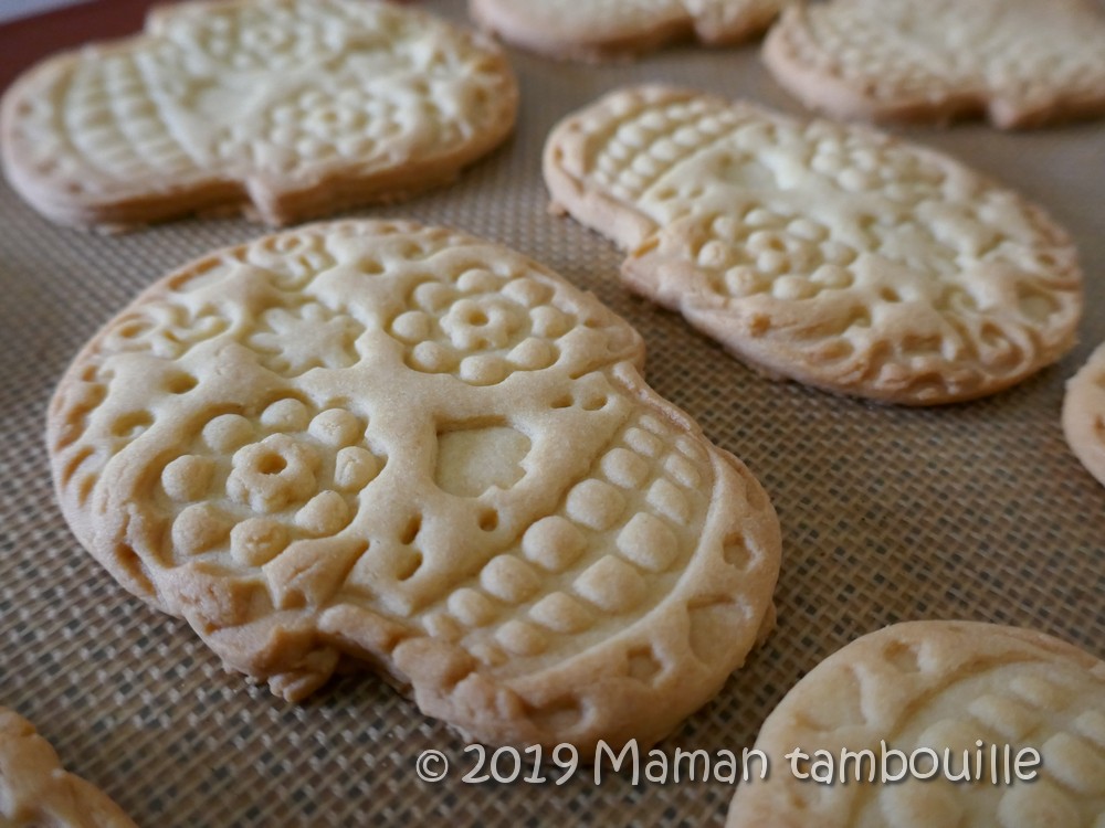 Pour cela, il a fallu trouver une pâte à biscuit qui ne colle pas et ne risque de rester coincée dans les petits recoins de l’emporte pièce et aussi une pâte qui conserve sa forme à la cuisson, pas simple tout ça ! J’ai opté pour une nouvelle recette que je n’avais pas encore expérimentée: les biscuits à la poudre à flan. Curieux mais finalement efficace et très bon ! J’ai choisi une poudre à flan à la vanille pour rester classique mais je testerais d’autres parfums (j’ai repéré « caramel au beurre salé », hummm !).