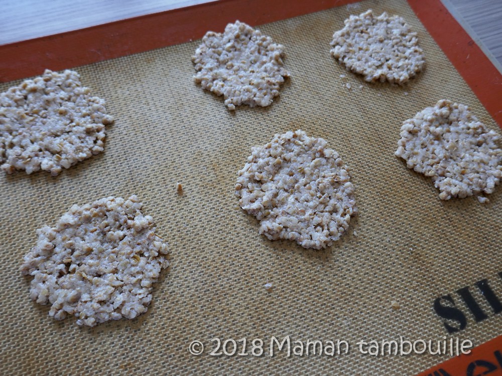 Former des tuiles de sarrasin sur une silpat et les aplatissant avec le dos d’une cuillère pour qu’elles soient assez fines.