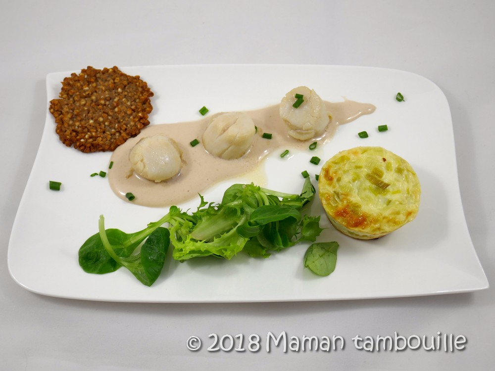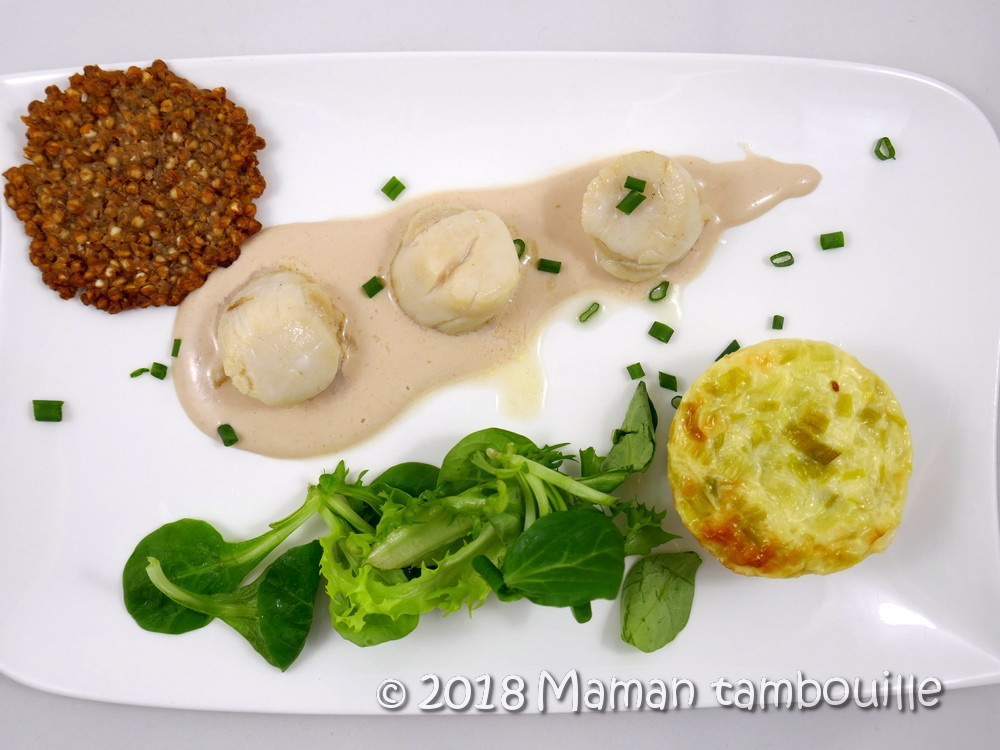 Hum, cette assiette était parfaite ! Des noix de Saint Jacques fraîches et bien goûteuses, une sauce au sarrasin rappelant la Bretagne, une tuile de sarrasin et un petit flan de poireau (recette des flans à venir).
