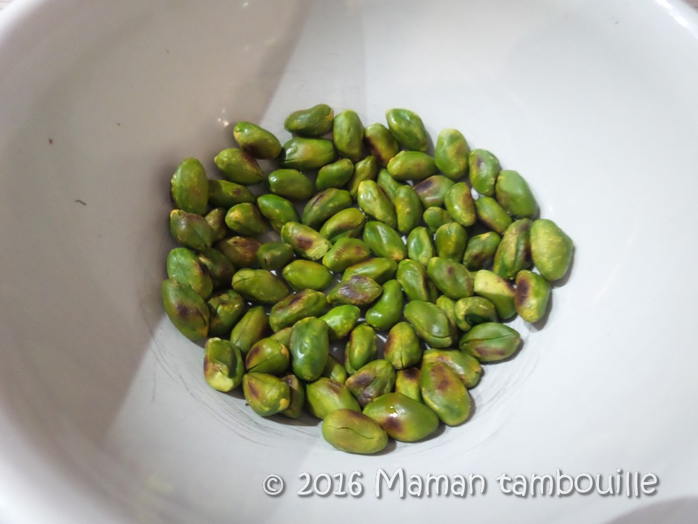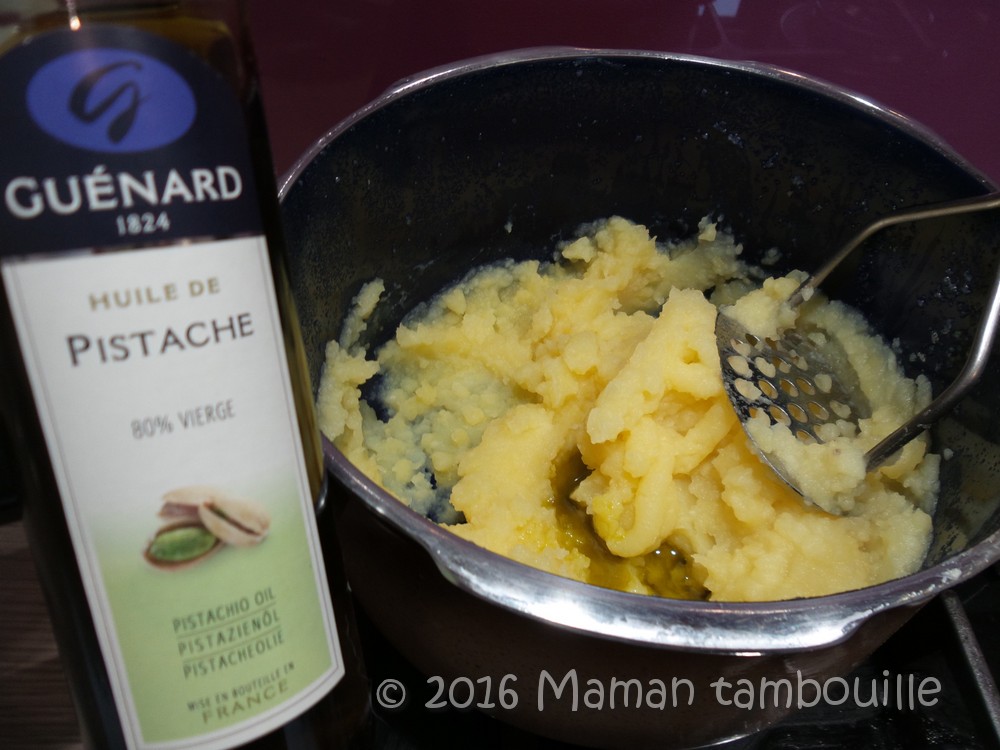 Les égoutter puis les écraser au presse purée. Ajouter un peu de lait pour l’assouplir ainsi que 3 cuillères à soupe d’huile de pistache.