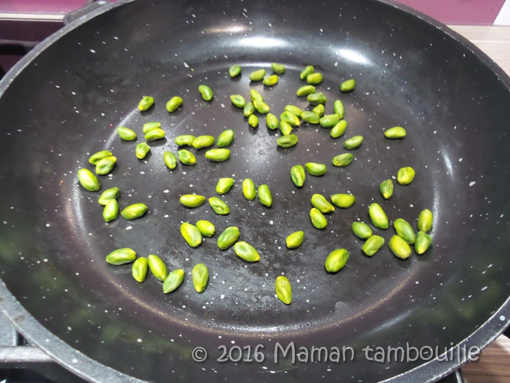 Faire griller les pistaches dans une poêle chaude sans matière grasse.