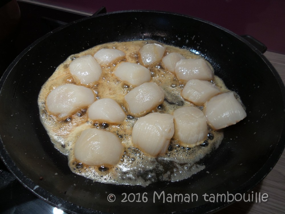 Déposer les Saint Jacques dans le beurre. Pencher la poêle et, avec une cuillère, arroser les Saint Jacques avec le beurre pour bien les napper. Les cuire environ 2 min par face selon leur taille tout en les arrosant de beurre tout le long de la cuisson.