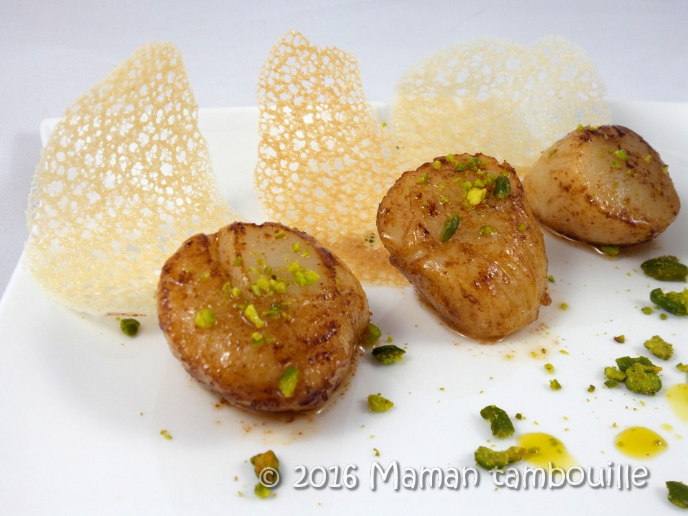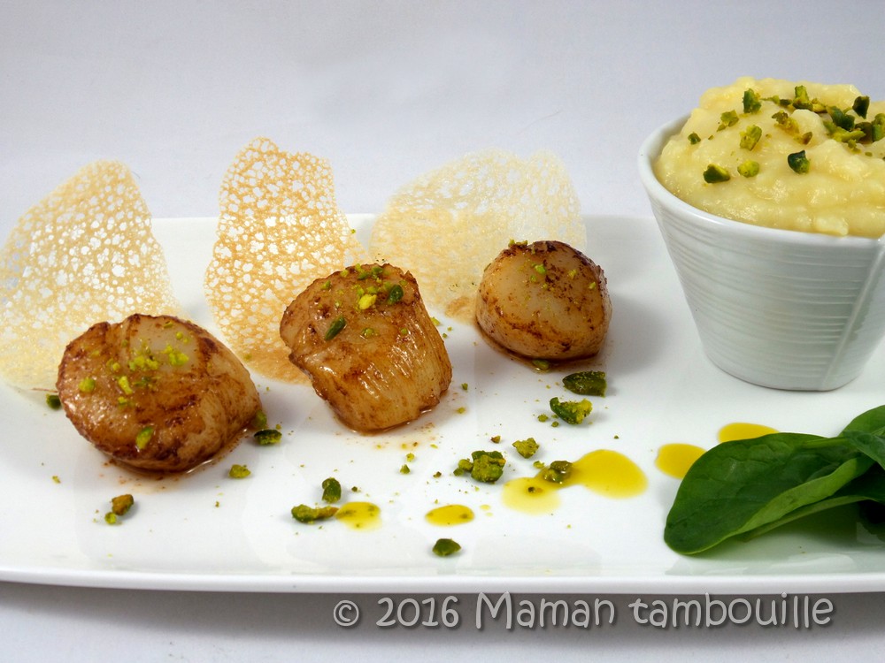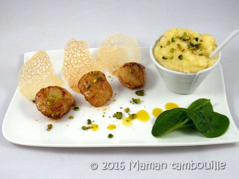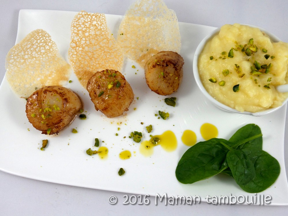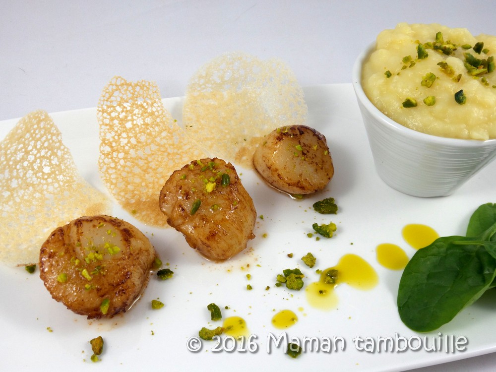 Dresser par assiette 3-4 Saint Jacques, les tuiles de pain, la purée à la pistache bien chaude.