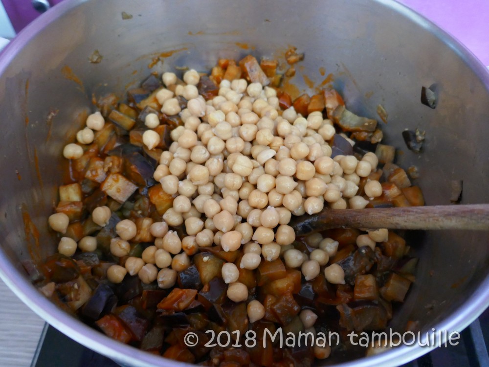 Ajouter les pois chiches égouttés et mijoter encore 5 min.