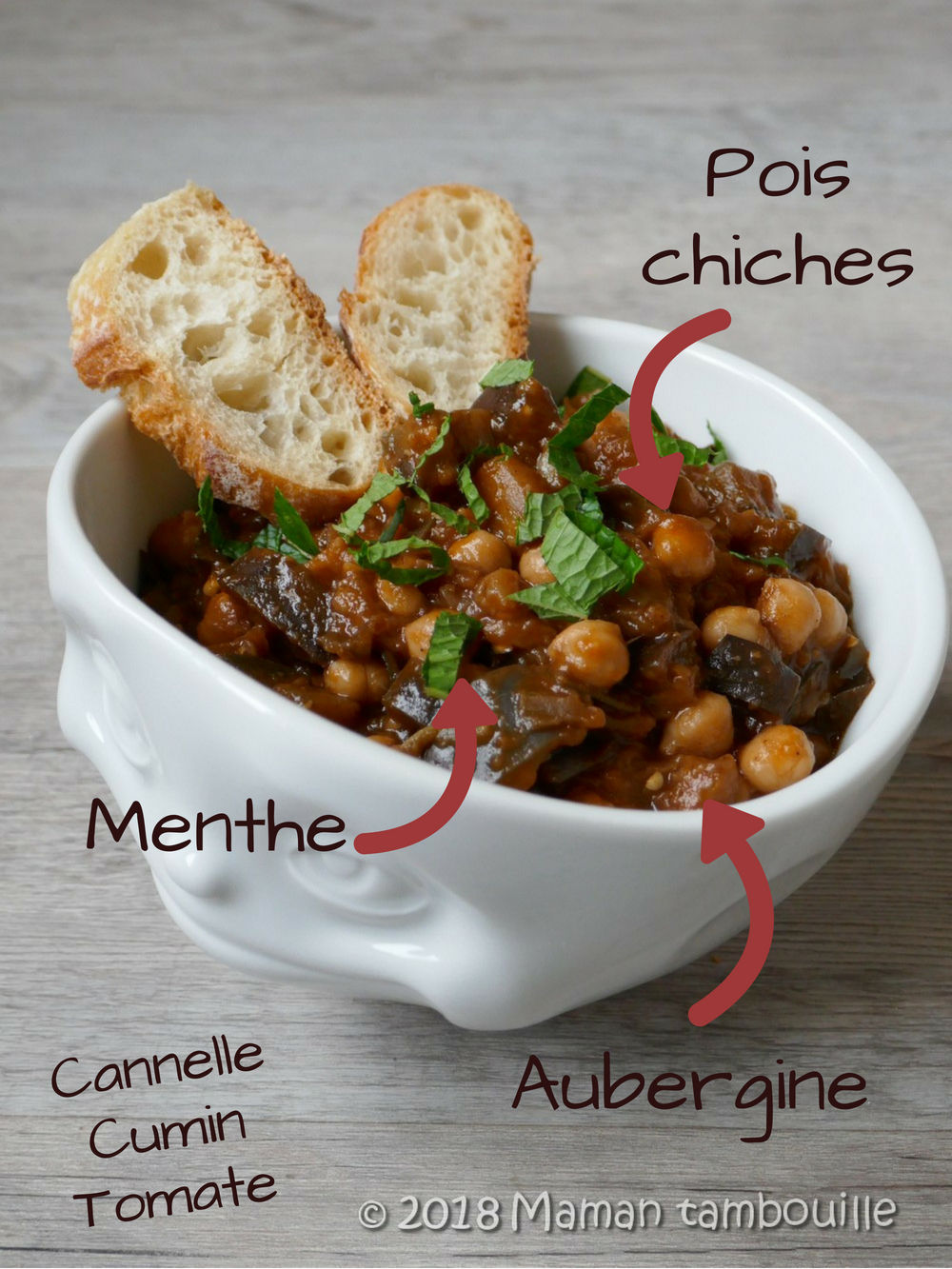 Réserver au frais jusqu’au lendemain. Au moment de servir, parsemer de menthe ciselée et accompagner de pain frais.