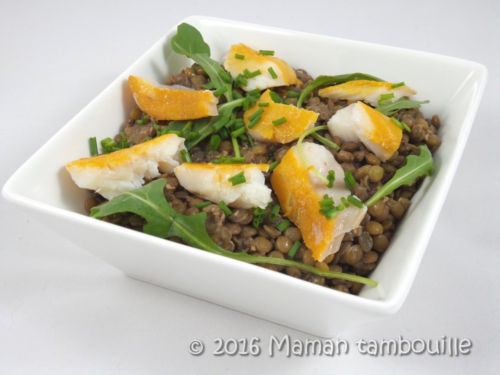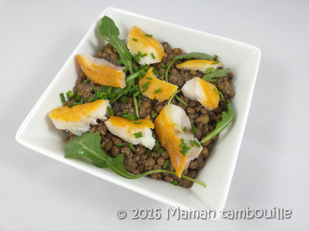 Oh là là, voilà une impro qui nous a vraiment beaucoup plu à Papa Tambouille et à moi ! J’ai eu l’idée de cette salade car je ne savais pas comment cuisiner un filet de haddock (à la base, je voulais le faire avec une sauce beurre blanc au gingembre et des pommes de terre en robe des champs mais je n’avais plus le temps !). Je suis tombée sur un paquet de lentilles vertes et comme j’adore des lentilles chaudes ou froides en salade, pourquoi ne pas faire une salade de lentilles au haddock !