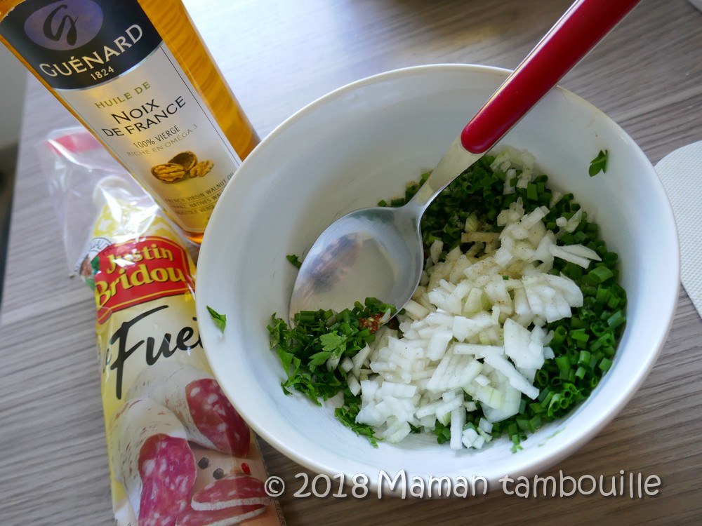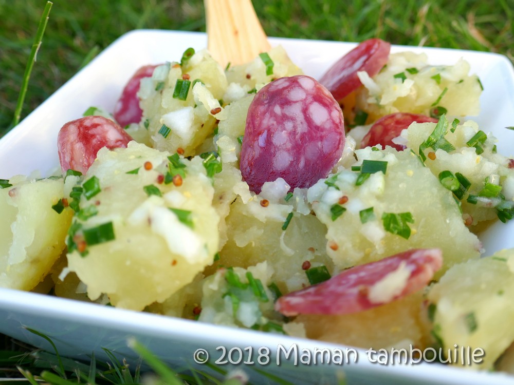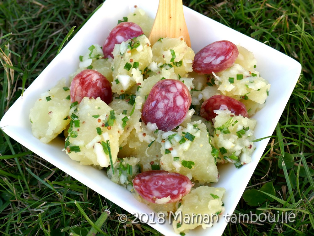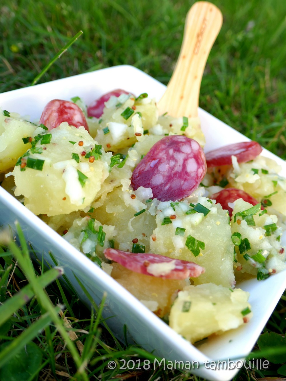 En manque d’idées pour cuisiner ? Plus rien dans le frigo ? Mon ingrédient fétiche quand je suis dans cette situation: la pomme de terre bien sûr ! J’en ai toujours en réserve et elle s’accommode de mille façons possibles. Dans mon cas, chaleur oblige, je me suis orientée vers une salade. C’est très classique je sais mais la vinaigrette fait toute la différence, ici, des herbes fraîches du jardin et une huile de noix savoureuse (l’huile de noix de France Guenard dont je suis fan). Quelques rondelles de saucisson pour la gourmandise et voilà le repas du soir qui est prêt !