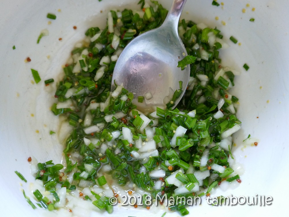 Ciseler la ciboulette et le persil. Mettre dans un bol. Ajouter l’échalote finement émincée, la moutarde, le vinaigre et du sel.